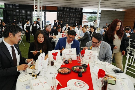 その後、今回のために特別幕の内弁当・マグロのお刺身・お寿司の提供をされたFelipe Ytuarte・Grupo fynso代表・日本食普及親善大使より、「この10年間で異国料理だった日本食は、我々の身近にある料理となった。日本酒、寿司、天ぷらなど、今後も日本食普及親善大使として、グアナファト州のメキシコ人の方に更に日本食を広めていきたい」と挨拶があった後、鏡開きが行われ、森田 篤・GTO支部長の乾杯の挨拶で会は一気に華やかに!