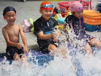 後半は、クロールや平泳ぎで距離やタイムに挑戦する子、より美しい泳ぎを身に付けようとアドバイスを積極的に受けて練習する子など、自分のめあてに合わせて挑戦しました。最後は水球や遊び道具を使っての自由時間で大騒ぎ。楽しく実りある学習となりました。