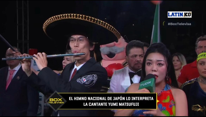 (写真右)整形外科医の多富廉志先生のお力添えで実現した、メキシコTelevisa生放送にて日本大使館の廣田司公使と君が代演奏。